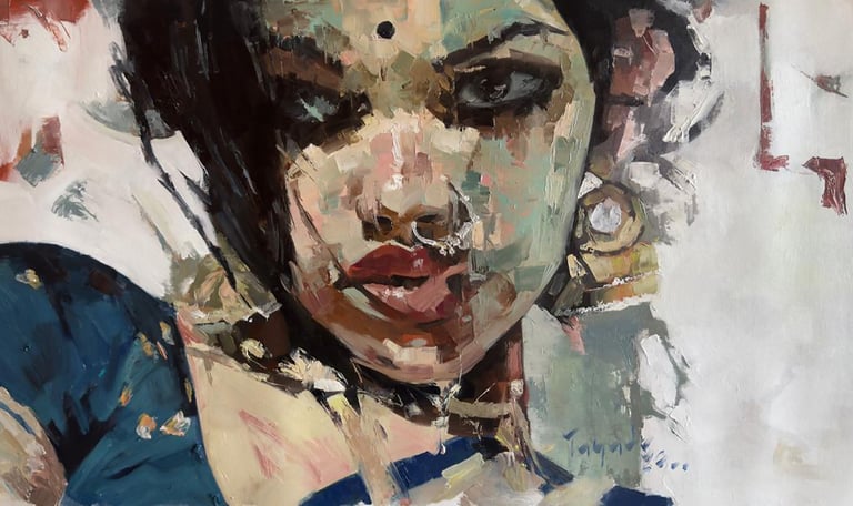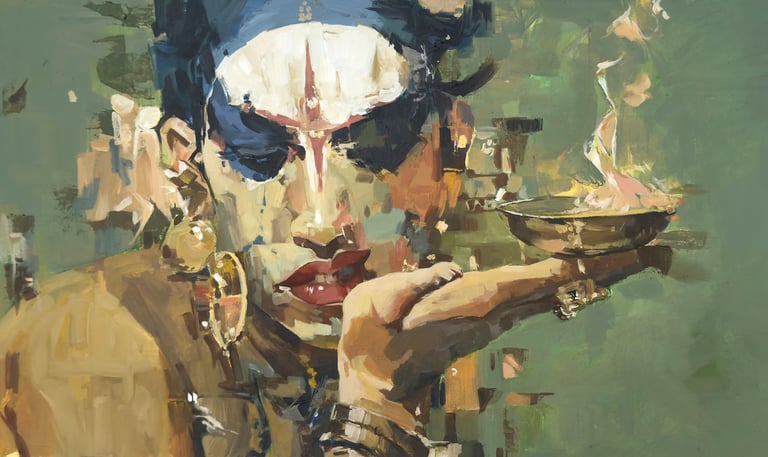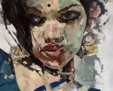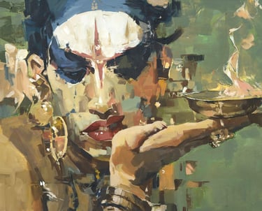 She gazes with intensity, her hands clasped, the brush strokes bold and expressive. Against a muted backdrop and dramatic chiaroscuro lighting, the figure emerges with authority.