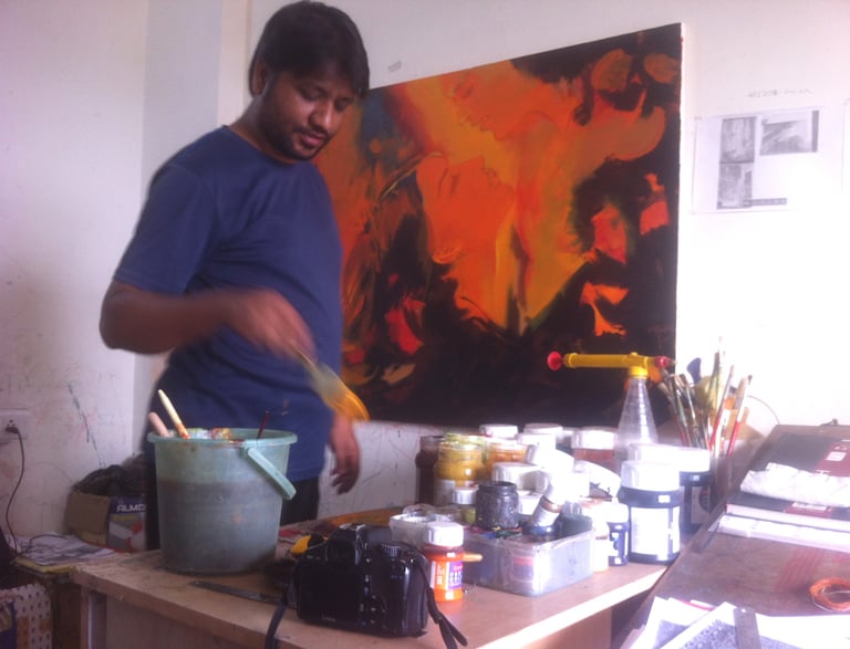 "I painted this Theyyam-inspired acrylic work to share the sacred energy of ritual fire, mirror reflections, and ancestral drumbeats, bridging traditional devotion and Gen Z creative expression."